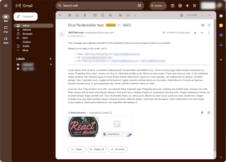 When your application sends an email using the SMTPMonster credentials, we'll take the From, To, CC & BCC and add them to the message body and send it all back to the username that logged in to the SMTPMonster server in the first place.